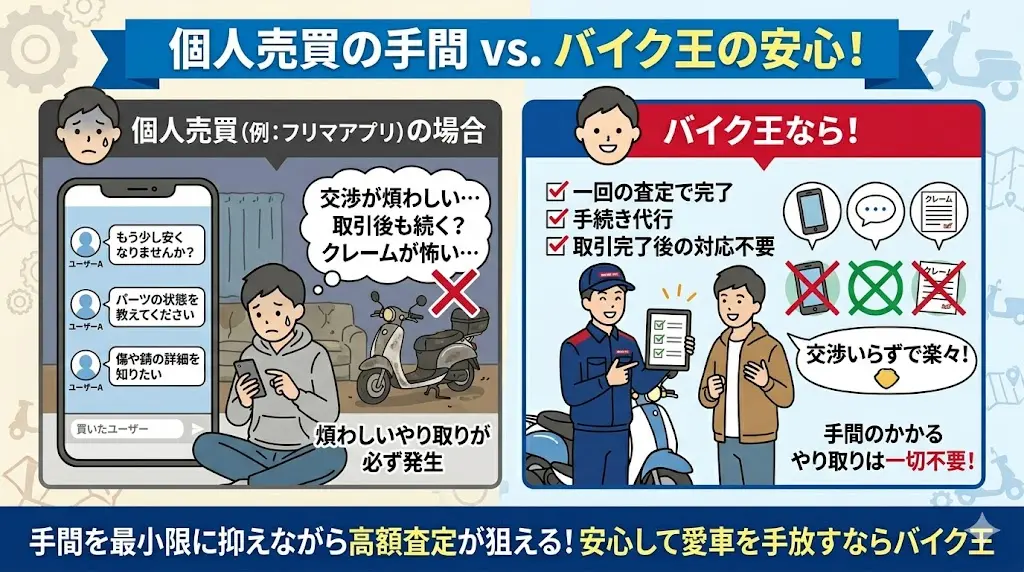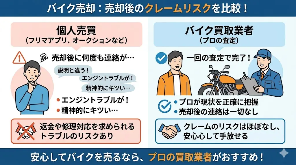 売却後のトラブルを防ぐ意味でも、バイク買取業者に売る方が楽できますしトラブルも防げます。