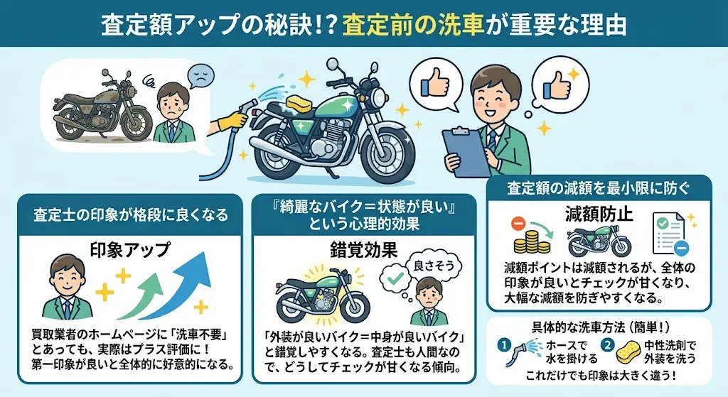 ”状態が良いバイク=中身が良いバイク”と錯覚しやすくなるため、査定で減額されにくくなるでしょう。