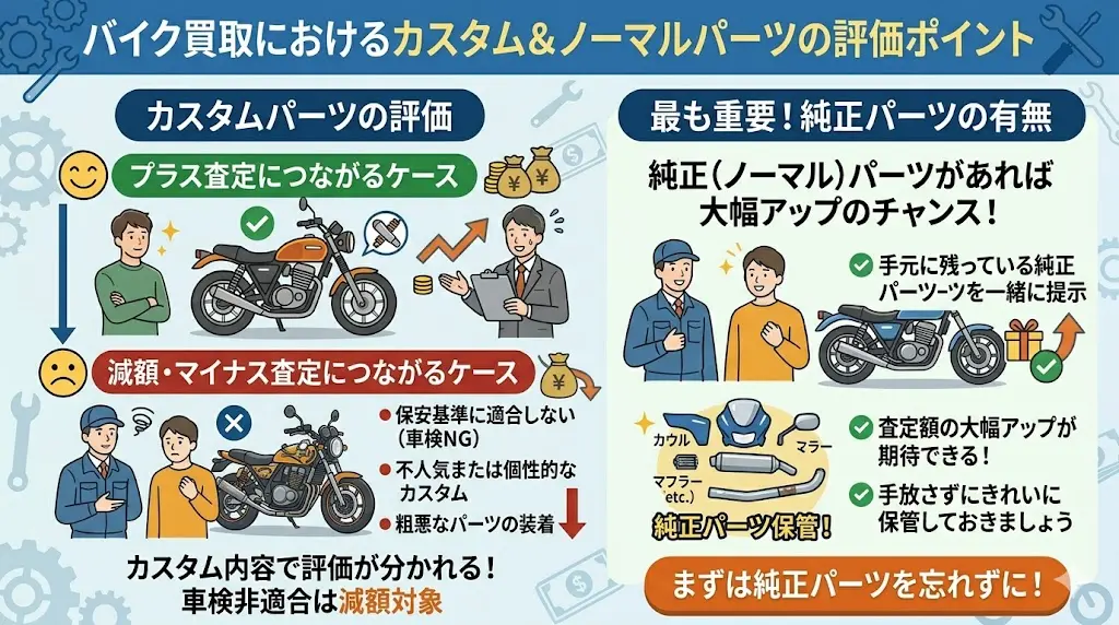 純正パーツが手元に残っている場合は、査定時に一緒に提示することで査定額がアップする可能性があります。