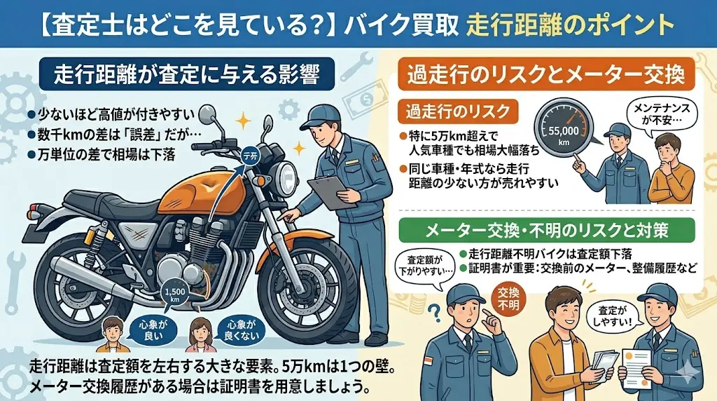 同じ車種同じ年式で走行距離が多いバイクと少ないバイクが並んでいれば、当然走行距離が少ないバイクの方が売れやすいです。