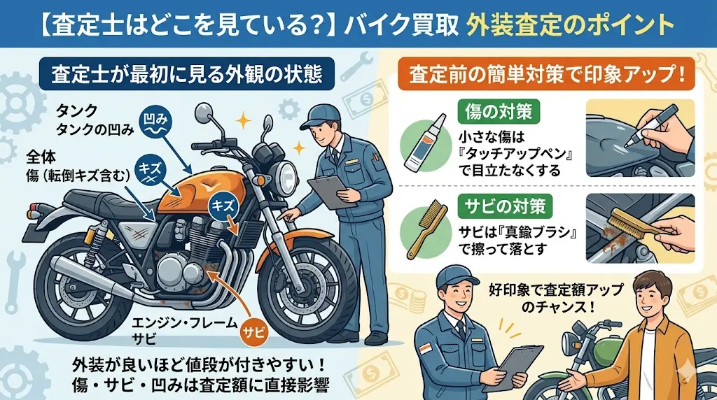 査定士が最初に確認するのが外装の状態です。傷・サビ・タンクの凹みは査定額に直接影響を与えるポイントであり、外装の状態が良いほど値段が付きやすいです。