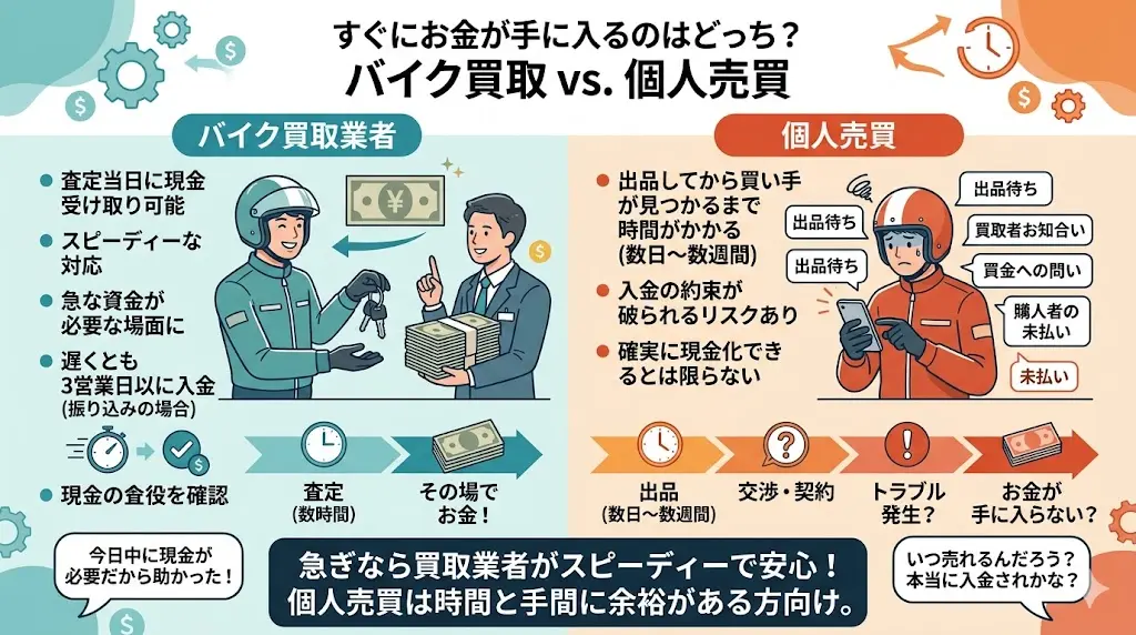 その点買取業者であれば査定当日に現金を受け取れるケースが多く、急いで資金が必要な場面でもスピーディーに対応してもらえます。