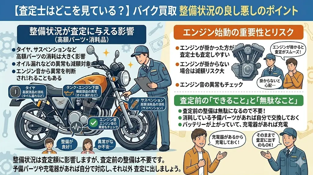 特に高額なパーツ(タイヤ、サスペンションなど)の消耗やオイル漏れなどの異常は査定に大きく影響しやすいです。