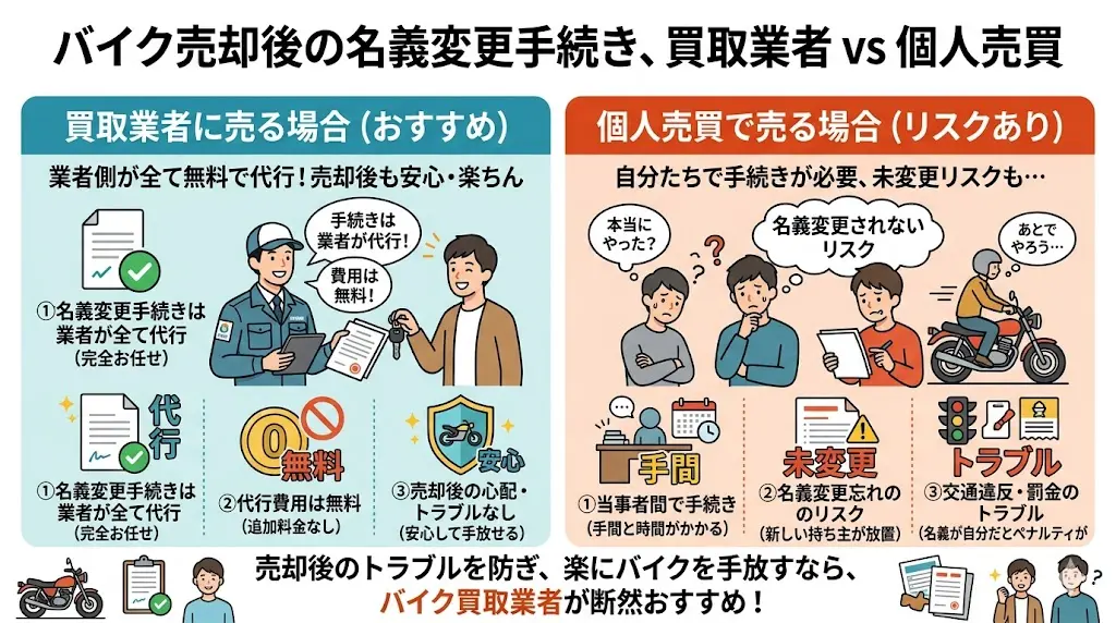 バイクの売却後には名義変更の手続きが必要ですが、買取業者に依頼すれば、名義変更の手続きはすべて業者側が行います。