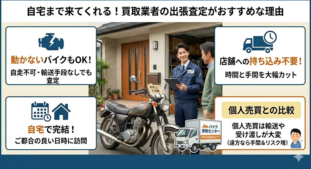 自走できないバイクや輸送手段がない場合でも、多くの買取業者は自宅まで出張査定に来てくれます。